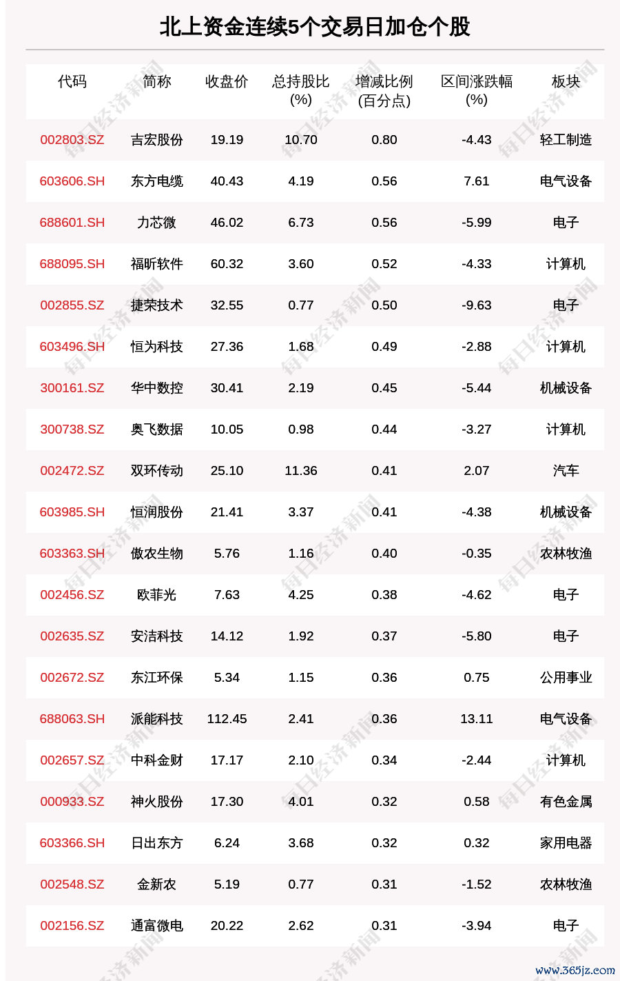 每经AI快讯,1月12日,北上资金连续5个交易日买入80只个股。北上资金连续5个交易日加仓个股中,吉宏股份(002803.SZ炒股配资查询,收盘价:19.19元)增持比例增幅最大,5个交易日增持0.80个百分点,其他增持比例较大的个股包括东方电缆(603606.SH,收盘价:40.43元)、力芯微(688601.SH,收盘价:46.02元)、福昕软件(688095.SH,收盘价:60.32元),分别增持0.56个百分点、0.56个百分点、0.52个百分点。