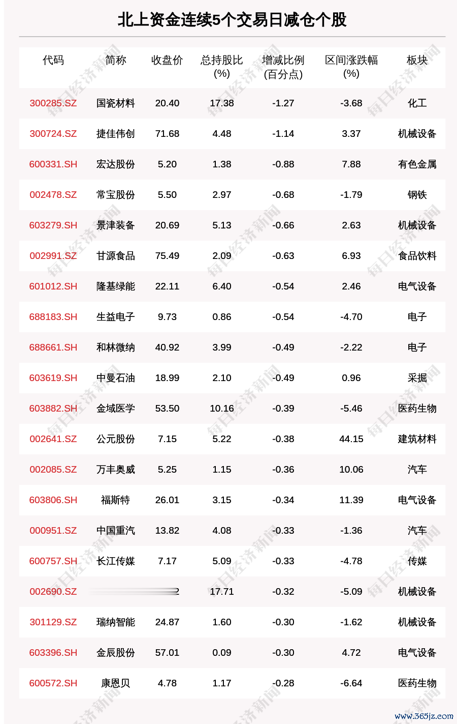 1月12日,北上资金连续5个交易日卖出81只个股。北上资金连续5个交易日减仓个股中,国瓷材料(300285.SZ,收盘价:20.40元)减持比例增幅最大,5个交易日减持1.27百分点,其他跌幅较大的个股包括捷佳伟创(300724.SZ,收盘价:71.68元)、宏达股份(600331.SH,收盘价:5.20元)、常宝股份(002478.SZ,收盘价:5.50元),分别减持1.14个百分点、0.88个百分点、0.68个百分点。
