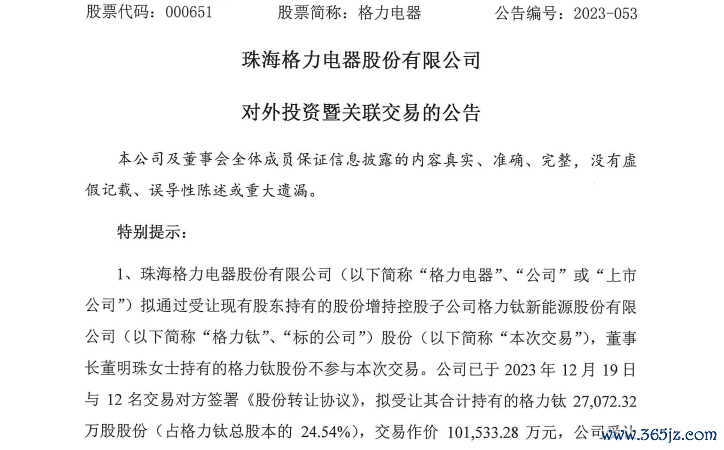 12月19日晚间,格力电器(000651)发布公告,公司拟通过受让现有股东持有的股份增持控股子公司格力钛新能源股份有限公司(简称“格力钛”)股份,公司已于12月19日与12名交易对方签署《股份转让协议》,拟受让其合计持有的24.54%格力钛股份,交易作价约10.15亿元。其中,格力电器董事长董明珠持有的格力钛股份不参与本次交易。